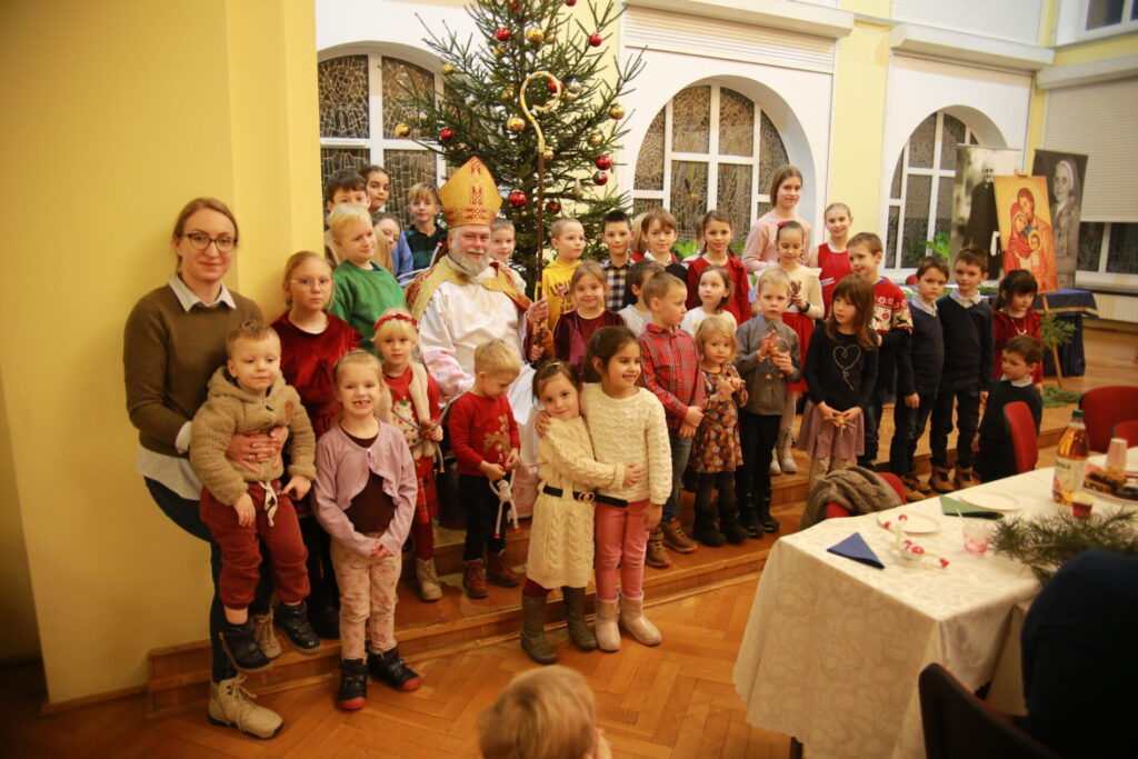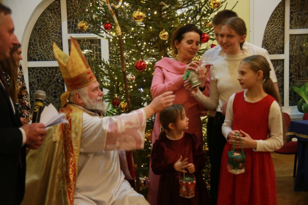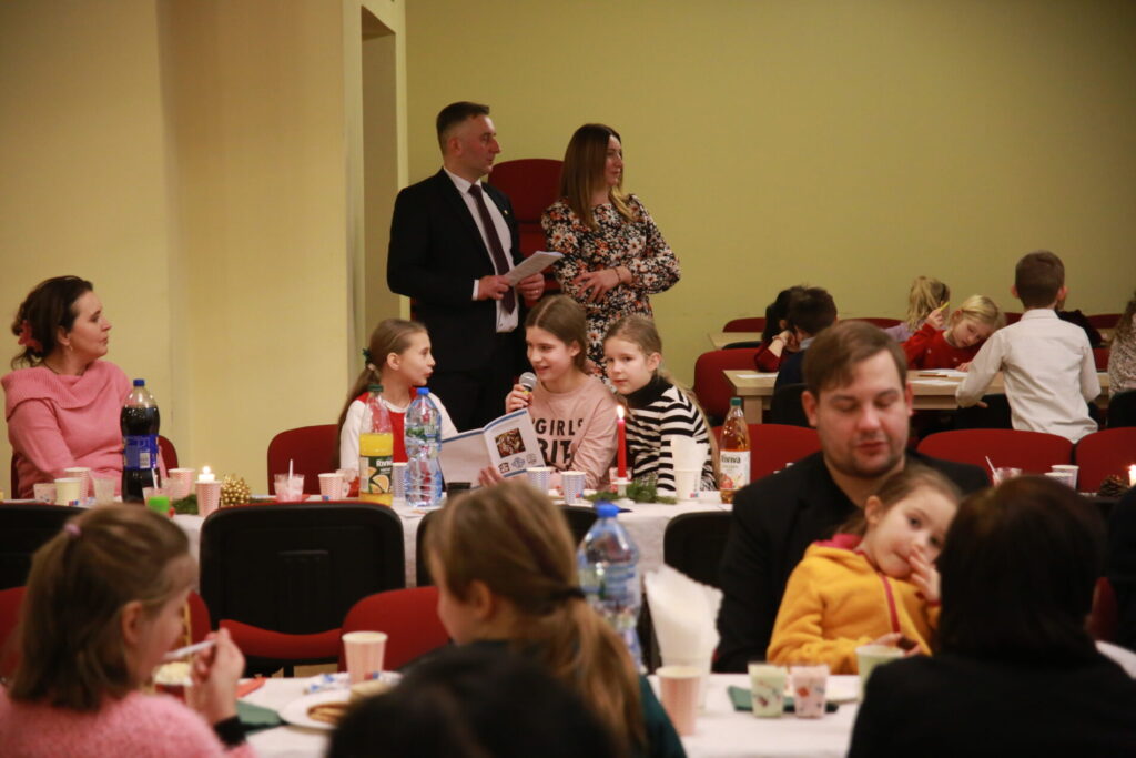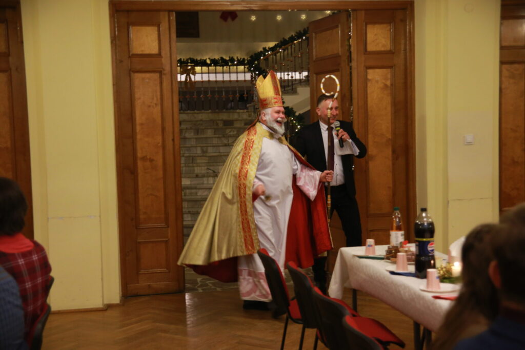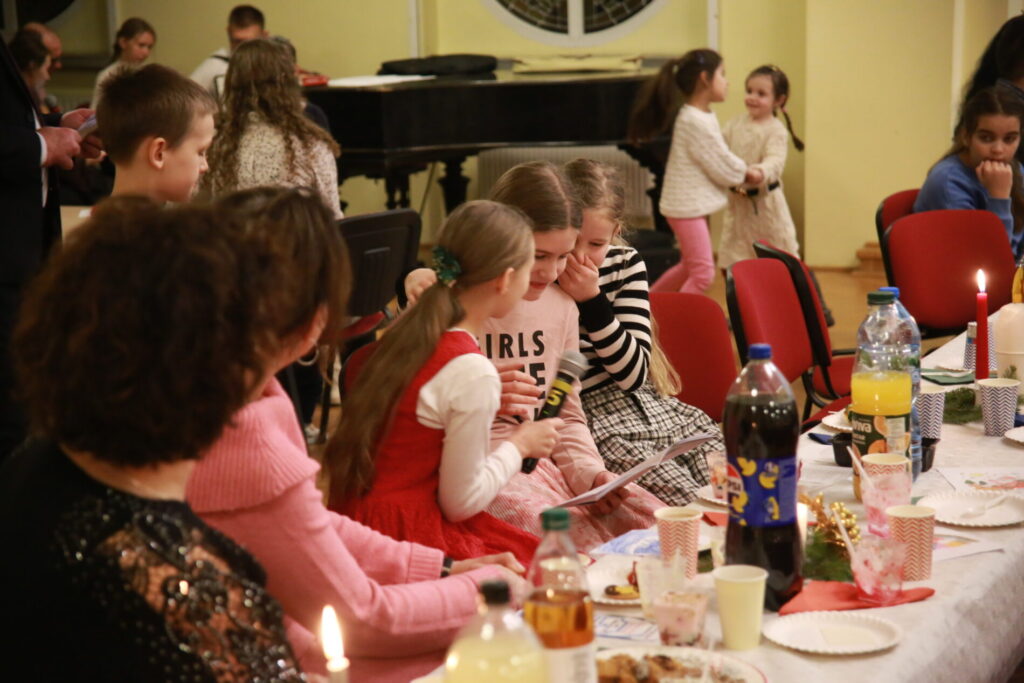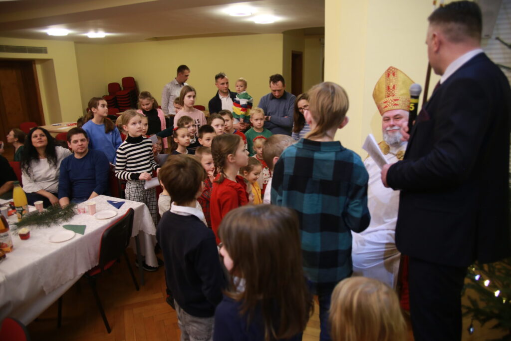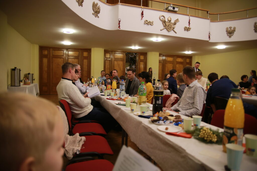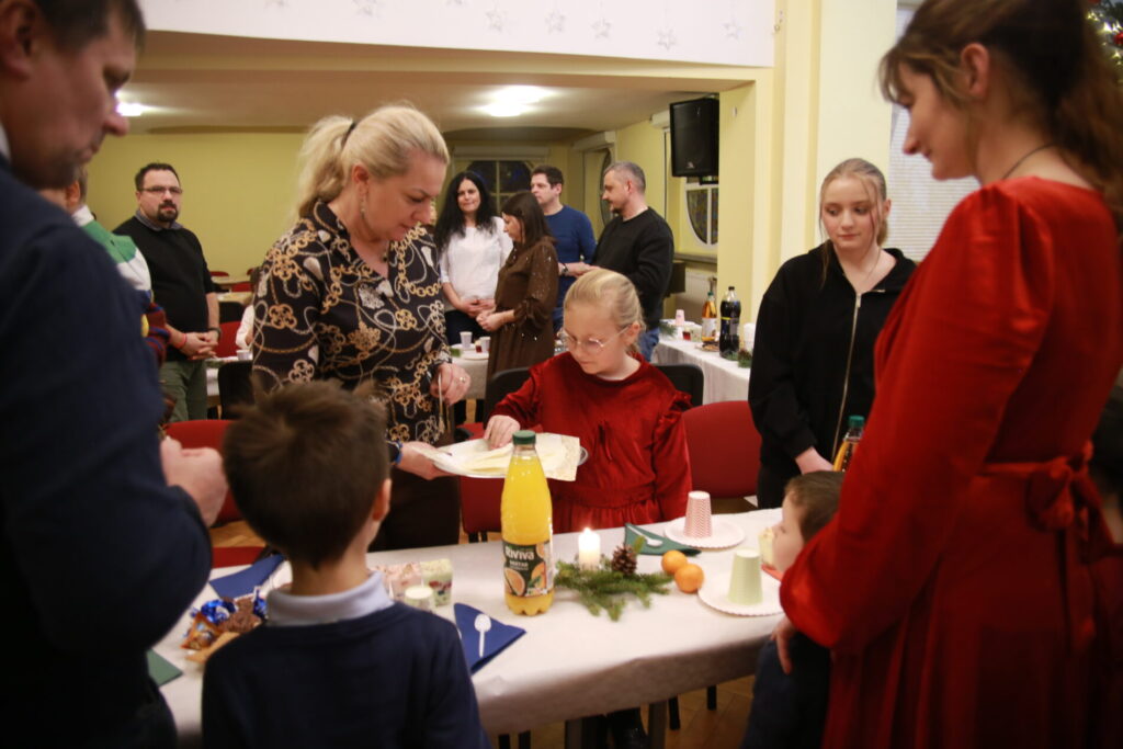 Spotkanie rozpoczęliśmy o 15.30 wspólną modlitwą przy stole, wsłuchując się w słowa ewangelii wg. św. Łukasza, a następnie dzieląc się opłatkiem w ten sposób, że z jednego talerza podawanego kolejnej osobie każdy ułamał dla siebie kawałek opłatka. Był to wyraźny gest symbolizujący przyjęcie i oddanie siebie drugiemu. Po wspólnej modlitwie mogliśmy częstować się przyniesionymi przez każdego wspaniałymi pysznościami. Czas wspólnych rozmów przeplatany był śpiewaniem kolęd, w czym pomogła diakonia muzyczna przygrywając na wszelakich instrumentach. Wyczekiwaną chwilą, szczególnie przez dzieci była wizyta św. Mikołaja, który z wielką radością obdarował każdego małym upominkiem oraz wspólnym zdjęciem. Dzieci również przygotowały dla św. Mikołaja niespodziankę. Oczekując na gościa pięknie pokolorowały wizerunki Mikołaja, by jak tylko przyjdzie wręczyć je.